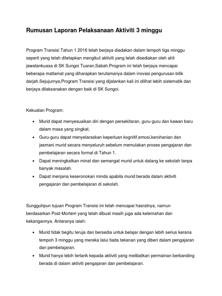 Rumusan Laporan Pelaksanaan Aktiviti 3 Minggu Program Transisi 2017 Pdf